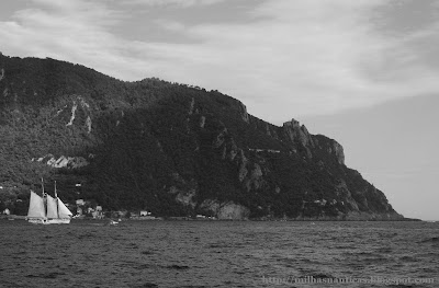 e o Tho pa ga (são ambos do mesmo proprietário), com o promontório de Portofino em "pano de fundo".