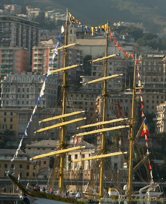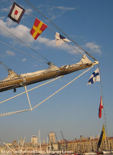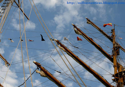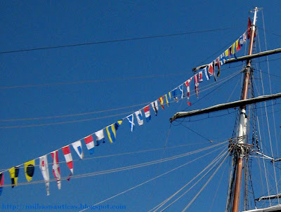 Não percebo nada deste tipo de bandeiras e embora goste de uma maior sobriedade em navios bonitos como estes, o embandeiramento dá-lhes um ar festivo que fica, no seu conjunto, engraçado. Pelo menos no Tejo ficou...